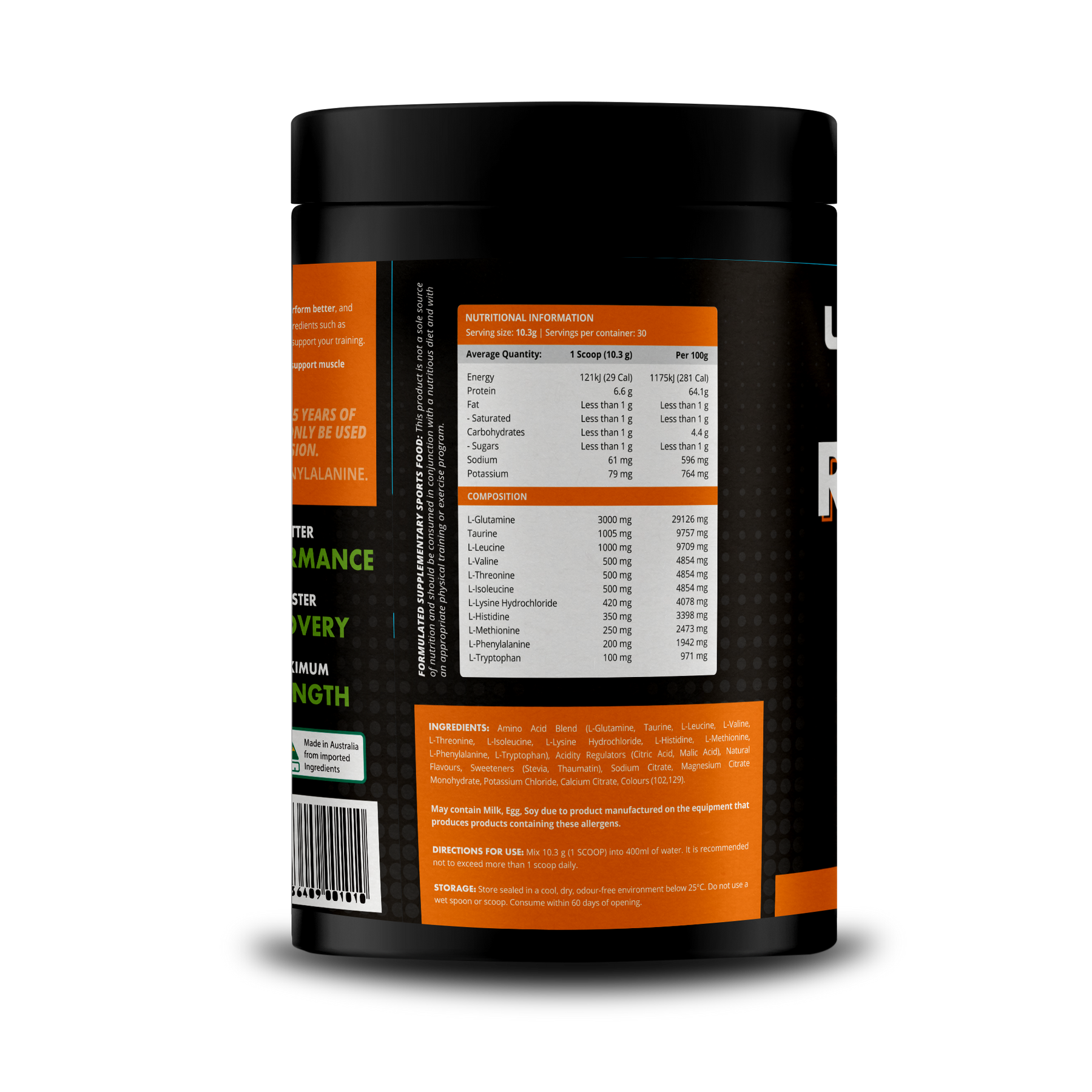 Amino Acid Blend (L-Glutamine, L-Leucine, Taurine, L-Lysine Hydrochloride, L-Threonine, L-Valine, L-Isoleucine, L-Phenylalanine, L-Histidine, L-Methionine, L-Tryptophan), Acidity Regulators (Citric Acid, Malic Acid), Natural Flavours, Sweeteners (Stevia, Thaumatin), Sodium Citrate, Magnesium Citrate Monohydrate, Potassium Chloride, Calcium Citrate, Colours (102,129).